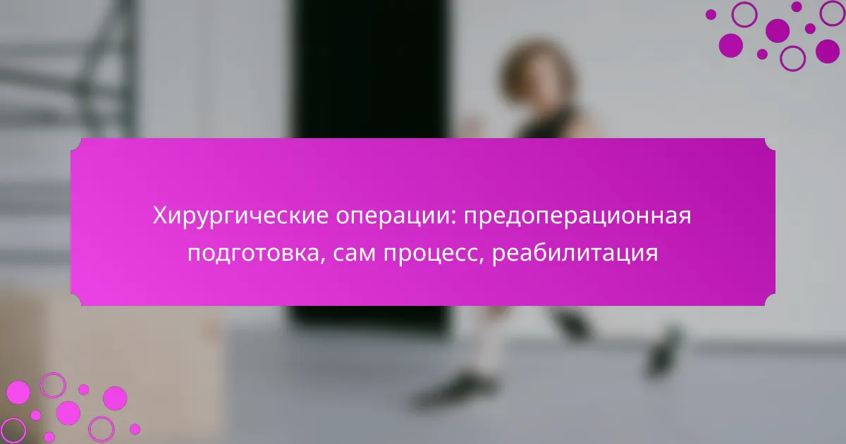Хирургические операции требуют тщательной подготовки, которая включает медицинские обследования и соблюдение диетических рекомендаций для обеспечения безопасности пациента. Сам процесс операции проходит в стерильной среде под контролем опытных специалистов, а реабилитация после вмешательства направлена на восстановление здоровья и может занять от нескольких недель до нескольких месяцев.