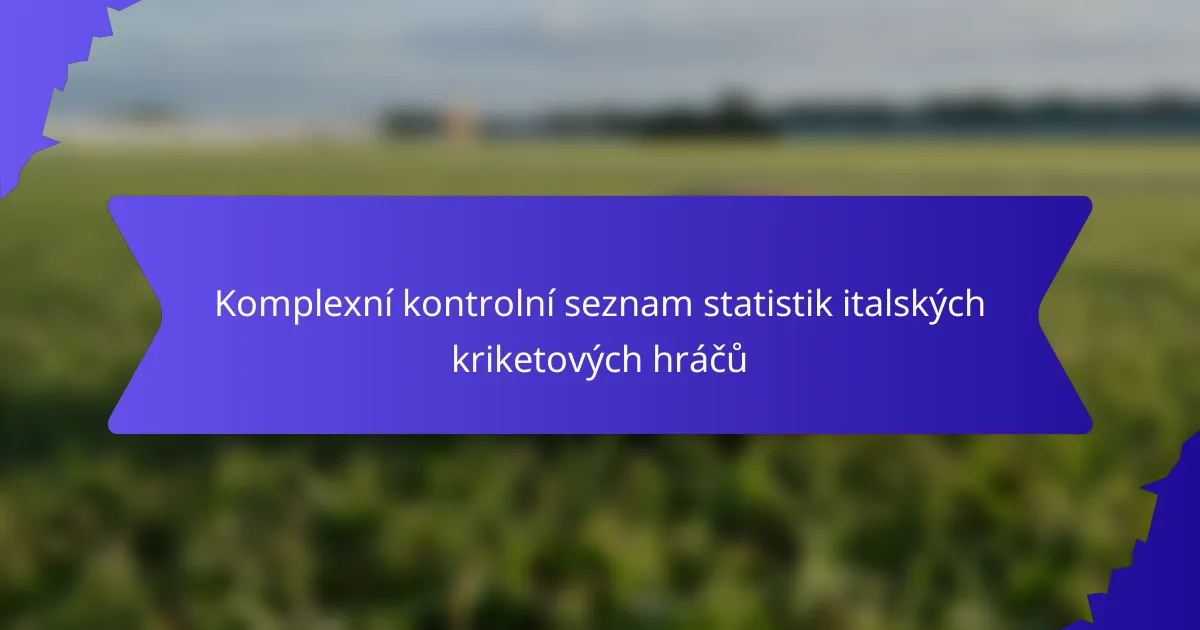 Tento komplexní kontrolní seznam statistik italských kriketových hráčů zdůrazňuje klíčové výkonnostní metriky, včetně průměrů v pálkování a bowlingu, účasti na zápasech a rekordů v poli. Jak se sport v Itálii nadále vyvíjí, tyto statistiky nabízejí cenné poznatky o přínosech hráčů a výzvách, kterým čelí ve srovnání s více etablovanými kriketovými národy. Historické trendy dále ilustrují růst a vývoj kriketu v Itálii, formovaný zvýšenou účastí a mezinárodním vystavením.